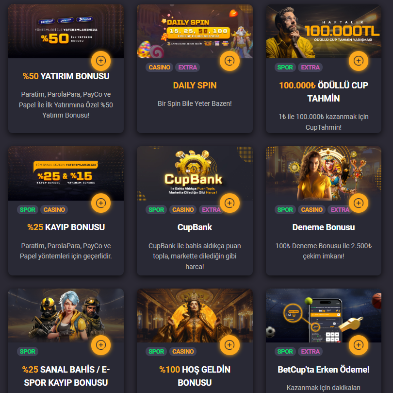 Betcup bonuslar noktasında oldukça iddialı çalışmalara imza atıyor ve 8 farkı promosyonla üyelere kazanç fırsatı sunuyor. Hesap açma işlemlerini tamamladıktan sonra 200 TL değerinde bir hoş geldin bonusunun sahibi olabilirsiniz. Ayrıca siteyi arkadaşınıza tavsiye ettiğinizde 250 TL değerinde arkadaş bonusu hediye ediliyor. Cepbank gibi finansal uygulamalarda minimum yüzde 15 maksimum yüzde 25 arasında para yatırma bonuslarının sahibi olabiliyorsunuz. Kayıp bonusları noktasında da sitede anlık ve haftalık bonuslar veriliyor. Dolayısı ile canlı bahis bürosu kampanyalar noktasında tam not alıyor.